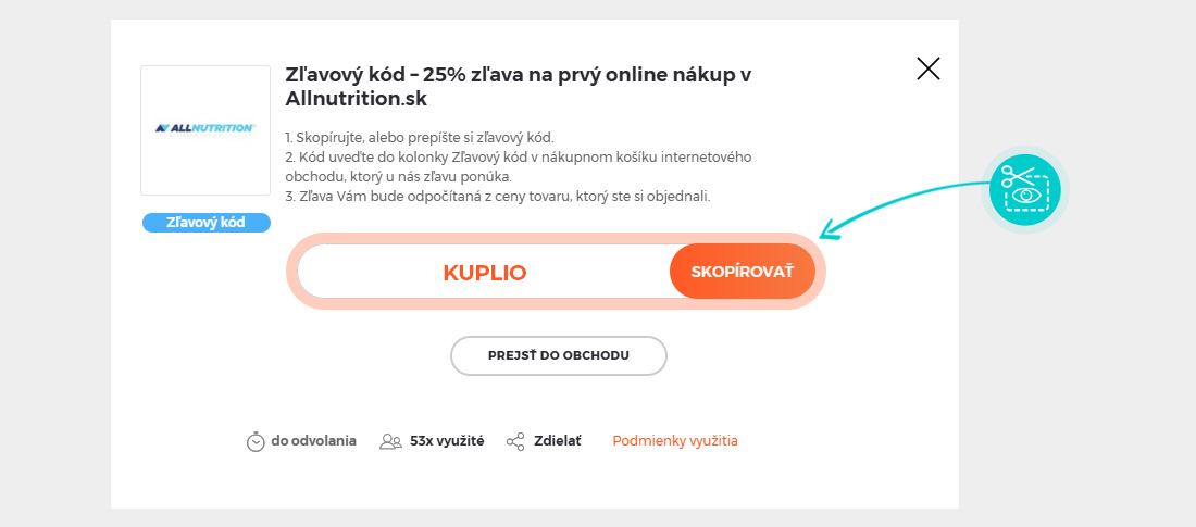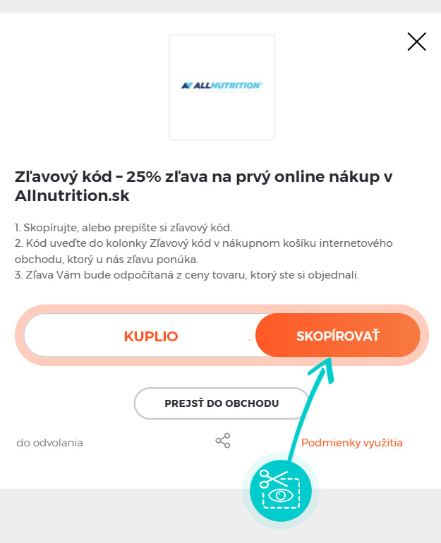 Skopírujte alebo si odpíšte zľavový kód a kliknite na tlačidlo „Prejsť do obchodu“. Následne budete presmerovaný priamo do e-shopu Allnutrition.sk.