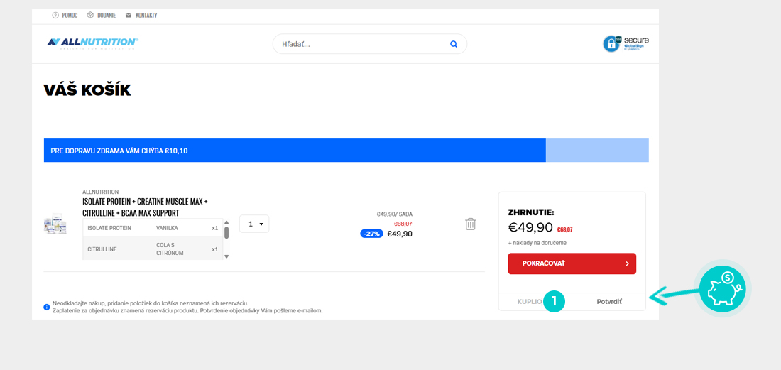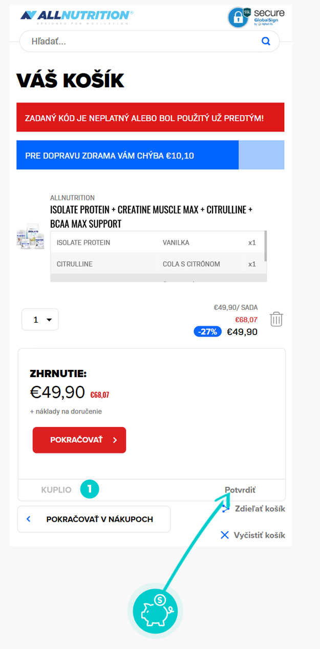 Vyberte si produkt v e-shope Allnutrition.sk, o ktorý máte záujem, stlačte tlačidlo „Pridať do košíka“ a produkt sa automaticky vloží do nákupného košíka. Priamo v nákupnom košíku nájdete v časti „Zhrnutie“ políčko „Pridať kupón“. Tu vložte skopírovaný zľavový kód alebo ho ručne vpíšte a potvrďte tlačidlom „Potvrdiť“.