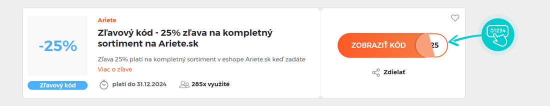 Vyberte si konkrétny zľavový kód na našej stránke, ktorý si chcete uplatniť v e-shope Ariete.sk. Kliknite na oranžové tlačidlo „Zobraziť kód“.