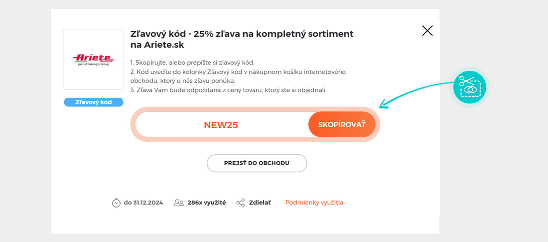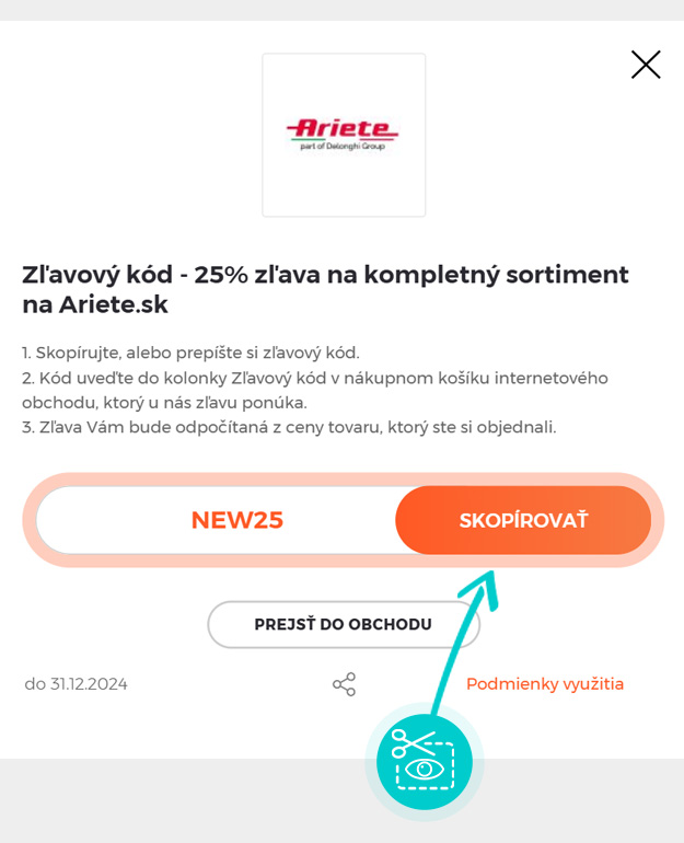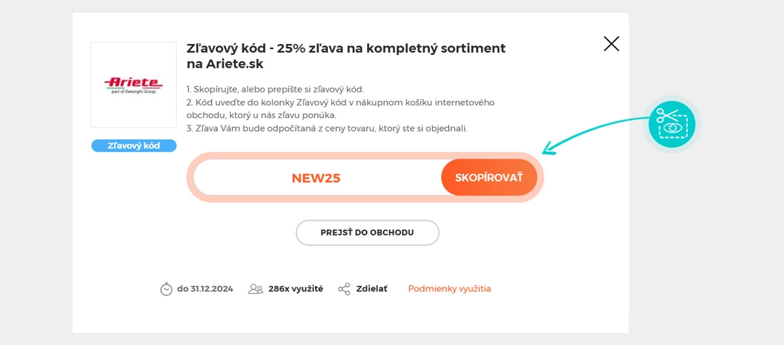 Skopírujte alebo si odpíšte zľavový kód a kliknite na tlačidlo „Prejsť do obchodu“. Následne budete presmerovaný priamo do e-shopu Ariete.sk.