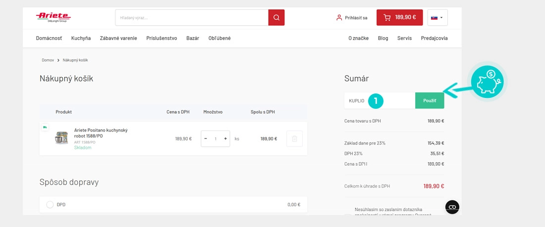 Vyberte si produkt v e-shope Ariete.sk, o ktorý máte záujem, stlačte tlačidlo „Do košíka“ a produkt sa automaticky vloží do nákupného košíka. Priamo v nákupnom košíku nájdete vpravo v časti "Sumár" políčko „% Mám zľavový kód“. Tu vložte skopírovaný zľavový kód alebo ho ručne vpíšte a potvrďte tlačidlom „Použiť“.