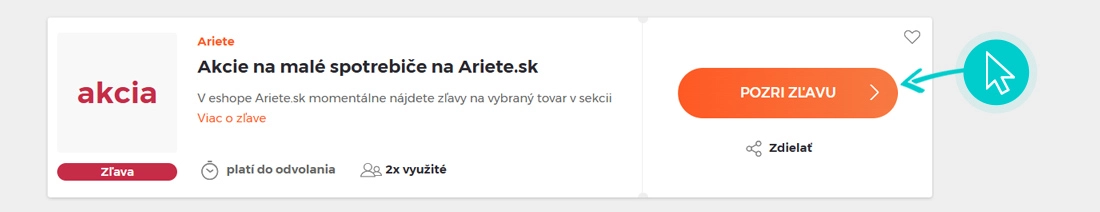 Vyberte si na našej stránke konkrétnu Ariete zľavu a kliknite na tlačidlo „Pozri zľavu“. Automaticky budete presmerovaný priamo na akciovú ponuku v internetovom obchode Ariete.sk, kde môžete produkt nakúpiť so zľavou.