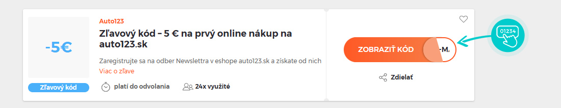 Vyberte si konkrétny zľavový kód na našej stránke, ktorý si chcete uplatniť v e-shope auto123.sk. Kliknite na oranžové tlačidlo „Zobraziť kód“.