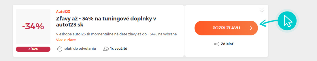 Vyberte si na našej stránke konkrétnu Auto123 zľavu a kliknite na tlačidlo „Pozri zľavu“. Automaticky budete presmerovaný priamo na akciovú ponuku v internetovom obchode auto123.sk, kde môžete produkt nakúpiť so zľavou.