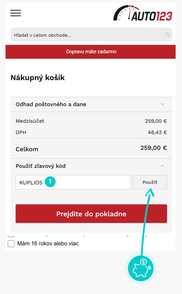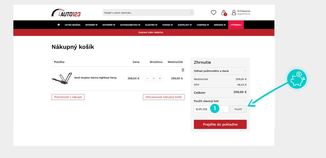 Vyberte si produkt v e-shope auto123.sk, o ktorý máte záujem, stlačte tlačidlo „Pridať do košíka“ a produkt sa automaticky vloží do nákupného košíka. Priamo v nákupnom košíku nájdete v časti „Zhrnutie“ políčko „Použiť zľavový kód“. Tu vložte skopírovaný zľavový kód alebo ho ručne vpíšte a potvrďte tlačidlom „Použiť“.