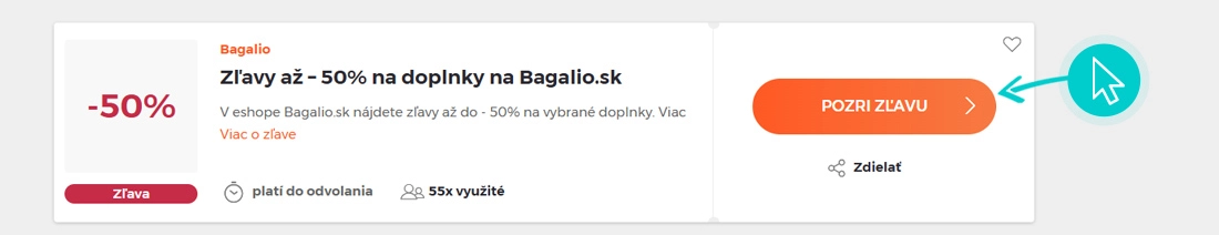 Vyberte si na našej stránke konkrétnu Bagalio zľavu a kliknite na tlačidlo „Pozri zľavu“. Automaticky budete presmerovaný priamo na akciovú ponuku v internetovom obchode Bagalio, kde môžete produkt nakúpiť so zľavou.