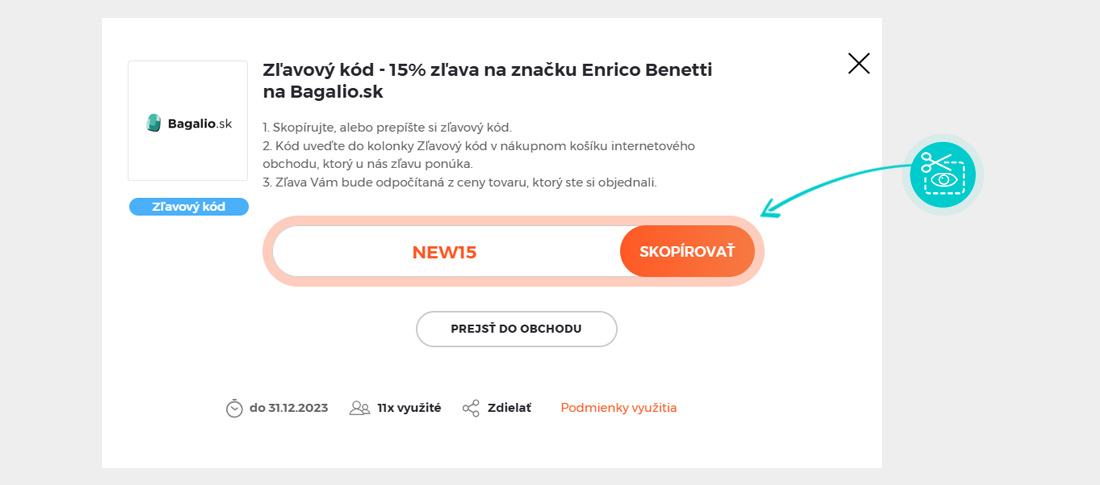 Skopírujte alebo si odpíšte zľavový kód a kliknite na tlačidlo „Prejsť do obchodu“. Následne budete presmerovaný priamo do e-shopu Bagalio.sk.