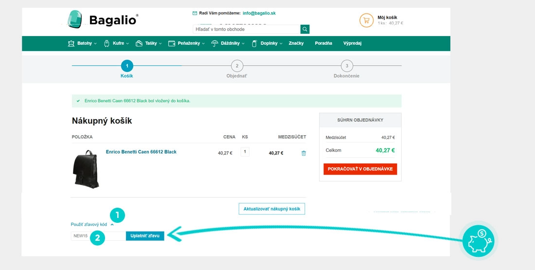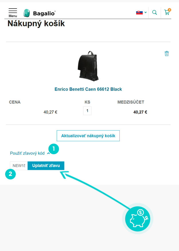 Vyberte si produkt v e-shope Bagalio.sk, o ktorý máte záujem, stlačte tlačidlo „Do košíka“ a produkt sa automaticky vloží do nákupného košíka. Priamo v nákupnom košíku nájdete v prvom kroku objednávania pod zoznamom objednávaných produktov políčko „Použiť zľavový kód“. Tu vložte skopírovaný zľavový kód alebo ho ručne vpíšte a potvrďte tlačidlom „Uplatniť zľavu“.