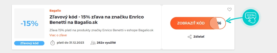 Vyberte si konkrétny zľavový kód na našej stránke, ktorý si chcete uplatniť v e-shope Bagalio.sk. Kliknite na oranžové tlačidlo „Zobraziť kód“.