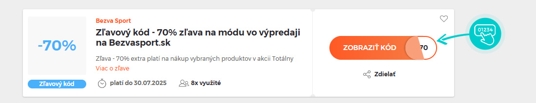 Vyberte si konkrétny zľavový kód na našej stránke, ktorý si chcete uplatniť v e-shope Bezvasport.sk. Kliknite na oranžové tlačidlo „Zobraziť kód“.
