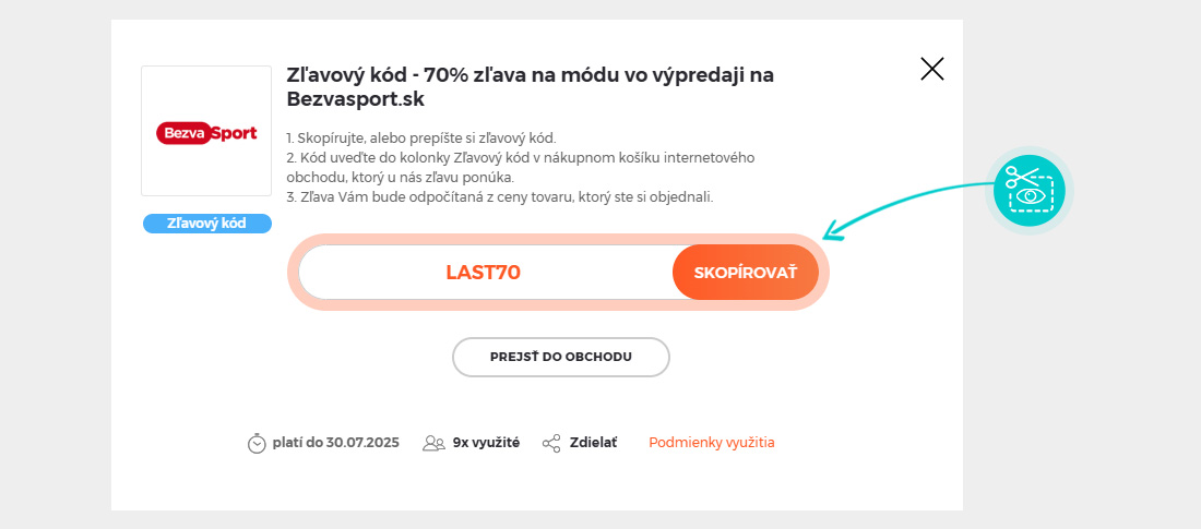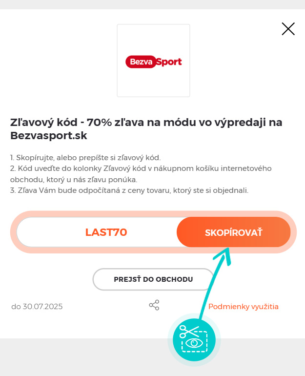 Skopírujte alebo si odpíšte zľavový kód a kliknite na tlačidlo „Prejsť do obchodu“. Následne budete presmerovaný priamo do e-shopu Bezvasport.sk.