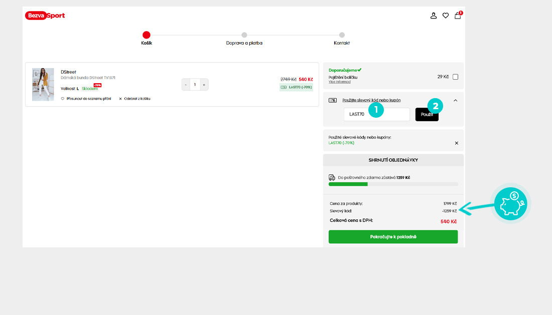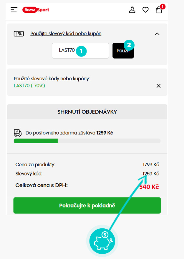 Vyberte si produkt v e-shope Bezvasport.sk, o ktorý máte záujem, stlačte tlačidlo „Pridať do košíka“ a produkt sa automaticky vloží do nákupného košíka. Priamo v nákupnom košíku nájdete políčko „Použiť zľavový kód alebo kupón“. Tu vložte skopírovaný zľavový kód alebo ho ručne vpíšte a potvrďte tlačidlom „Uplatniť“.