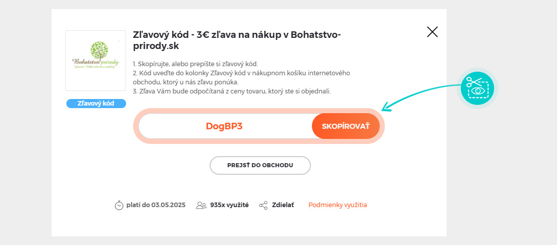 Skopírujte alebo si odpíšte zľavový kód a kliknite na tlačidlo „Prejsť do obchodu“. Následne budete presmerovaný priamo do e-shopu Bohatstvo-prirody.sk.