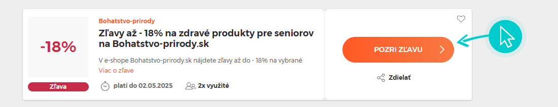 Vyberte si na našej stránke konkrétnu Bohatstvo-prírody zľavu a kliknite na tlačidlo „Pozri zľavu“. Automaticky budete presmerovaný priamo na akciovú ponuku v internetovom obchode Bohatstvo-prirody.sk, kde môžete produkt nakúpiť so zľavou.