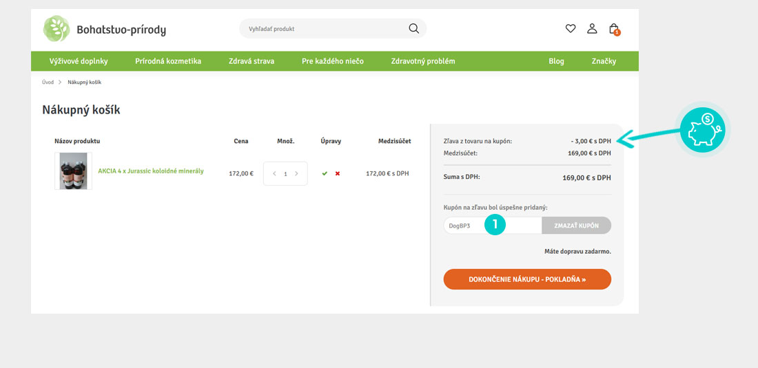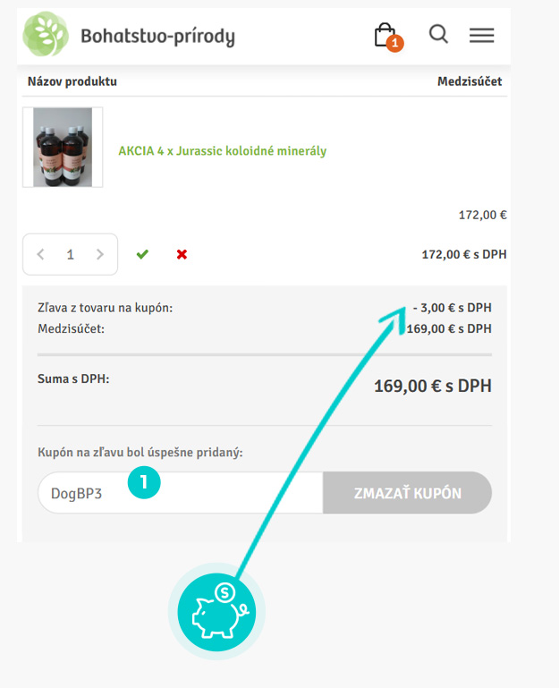 Vyberte si produkt v e-shope Bohatstvo-prirody.sk, o ktorý máte záujem, stlačte tlačidlo „Do košíka“ a produkt sa automaticky vloží do nákupného košíka. Priamo v nákupnom košíku nájdete vpravo nad časťou "Zhrnutie" políčko „Použiť zľavový kupón“. Tu vložte skopírovaný zľavový kód alebo ho ručne vpíšte a potvrďte tlačidlom „Odoslať“.