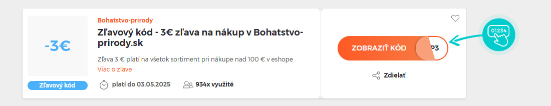 Vyberte si konkrétny zľavový kód na našej stránke, ktorý si chcete uplatniť v e-shope Bohatstvo-prirody.sk. Kliknite na oranžové tlačidlo „Zobraziť kód“.