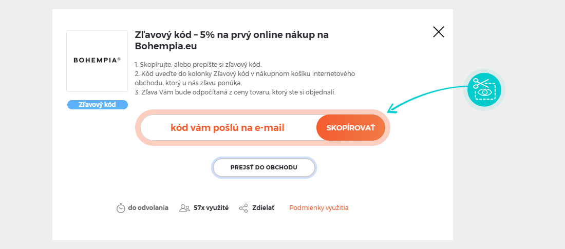 Skopírujte alebo si odpíšte zľavový kód a kliknite na tlačidlo „Prejsť do obchodu“. Následne budete presmerovaný priamo do e-shopu Bohempia.eu.