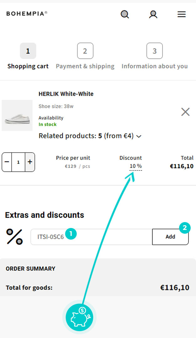 Vyberte si produkt v e-shope Bohempia.eu, o ktorý máte záujem, stlačte tlačidlo „Pridať do košíka“ a produkt sa automaticky vloží do nákupného košíka. Priamo v nákupnom košíku nájdete pod Vami vybraným produktom políčko „Zľavový kód“. Tu vložte skopírovaný zľavový kód alebo ho ručne vpíšte a potvrďte tlačidlom „Pridať“.