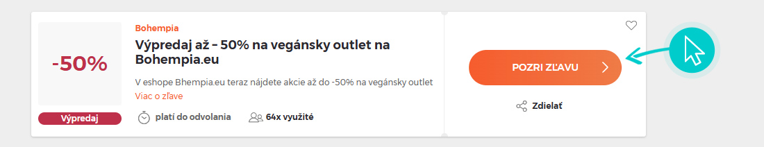 Vyberte si na našej stránke konkrétnu Bohempia zľavu a kliknite na tlačidlo „Pozri zľavu“. Automaticky budete presmerovaný priamo na akciovú ponuku v internetovom obchode Bohempia.eu, kde môžete produkt nakúpiť so zľavou.