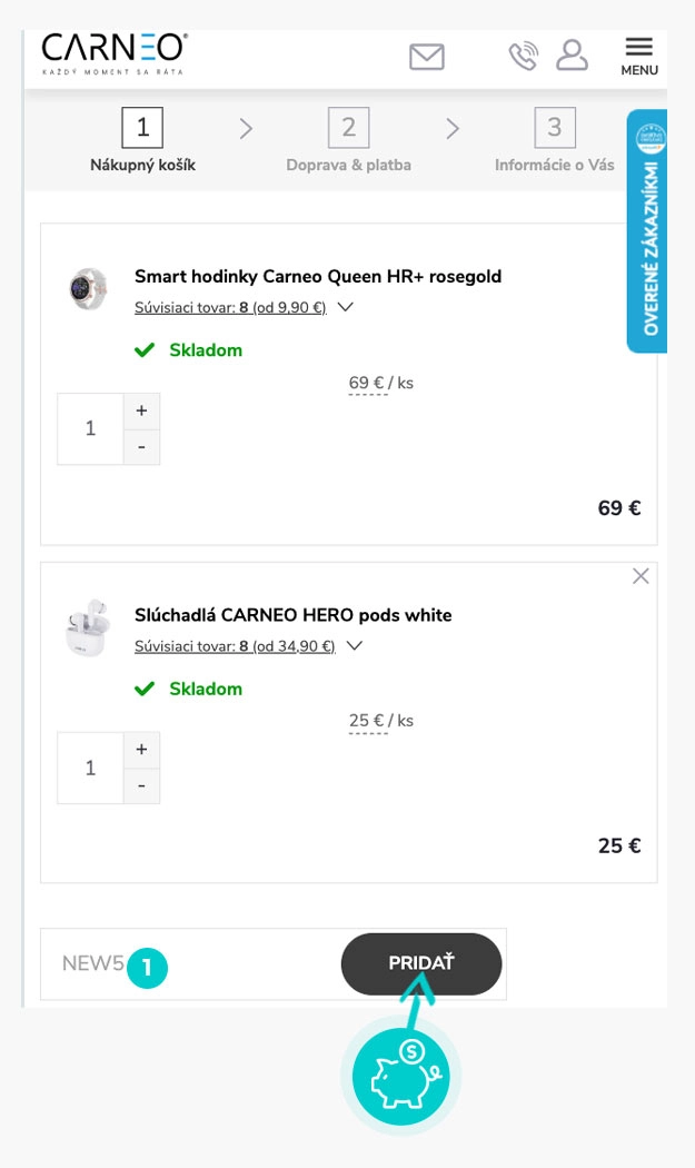 Skopírujte alebo si odpíšte zľavový kód a kliknite na tlačidlo „Prejsť do obchodu“. Následne budete presmerovaný priamo do e-shopu Carneo.sk.