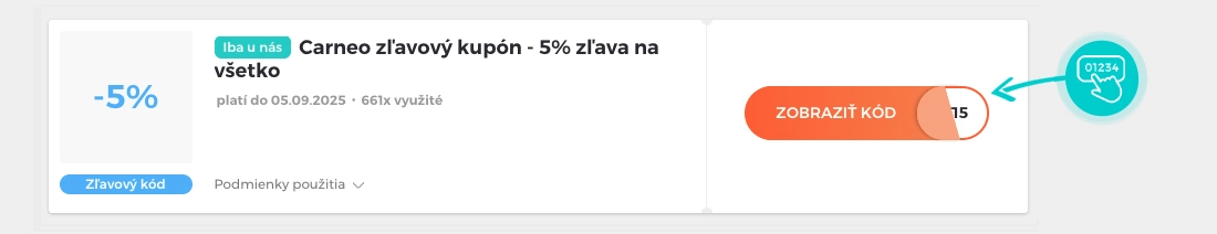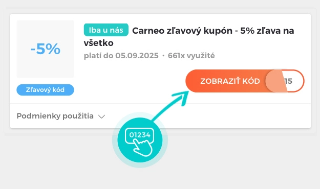 Vyberte si konkrétny zľavový kód na našej stránke, ktorý si chcete uplatniť v e-shope Carneo.sk. Kliknite na oranžové tlačidlo „Zobraziť kód“.