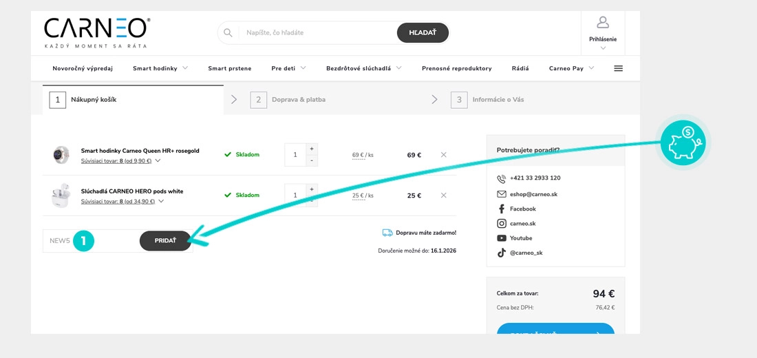 Vyberte si produkt v e-shope Carneo.sk, o ktorý máte záujem, stlačte tlačidlo „Pridať do košíka“ a produkt sa automaticky vloží do nákupného košíka. Priamo v nákupnom košíku nájdete pod Vami vybraným produktom políčko „Vložiť zľavový kód“. Tu vložte skopírovaný zľavový kód alebo ho ručne vpíšte a potvrďte tlačidlom „Pridať“.