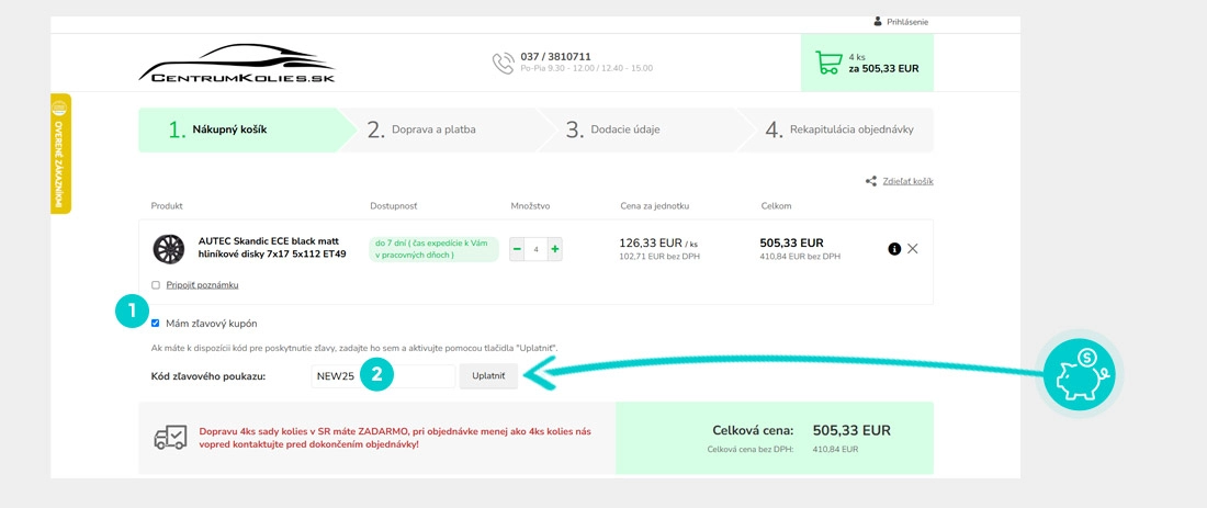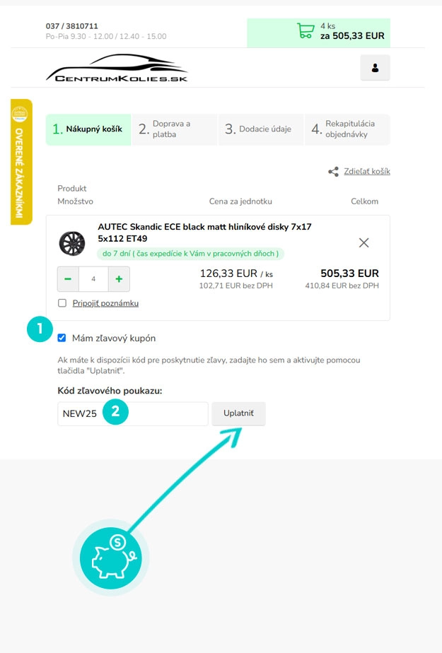 Vyberte si produkt v e-shope Centrumkolies.sk, o ktorý máte záujem, stlačte tlačidlo „Pridať do košíka“ a produkt sa automaticky vloží do nákupného košíka. Priamo v nákupnom košíku nájdete pod Vami vybraným produktom políčko „Mám zľavový kupón“. Tu vložte skopírovaný zľavový kód alebo ho ručne vpíšte a potvrďte tlačidlom „Uplatniť“.