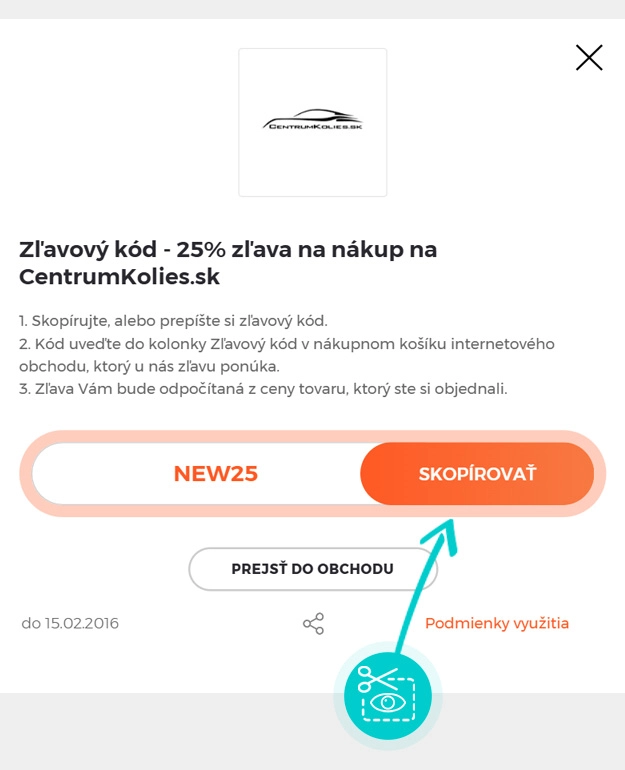 Skopírujte alebo si odpíšte zľavový kód a kliknite na tlačidlo „Prejsť do obchodu“. Následne budete presmerovaný priamo do e-shopu Centrumkolies.sk.