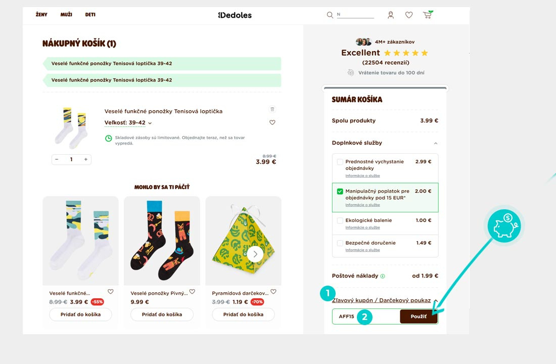 Vyberte si produkt v eshope Dedoles.sk, o ktorý máte záujem, stlačte tlačidlo „Do košíka“ a produkt sa automaticky vloží do nákupného košíka. Priamo v nákupnom košíku nájdete dole políčko „Zľavový kupón/Darčekový poukaz“. Tu vložte skopírovaný zľavový kód alebo ho ručne vpíšte a potvrďte tlačidlom „Použiť“.