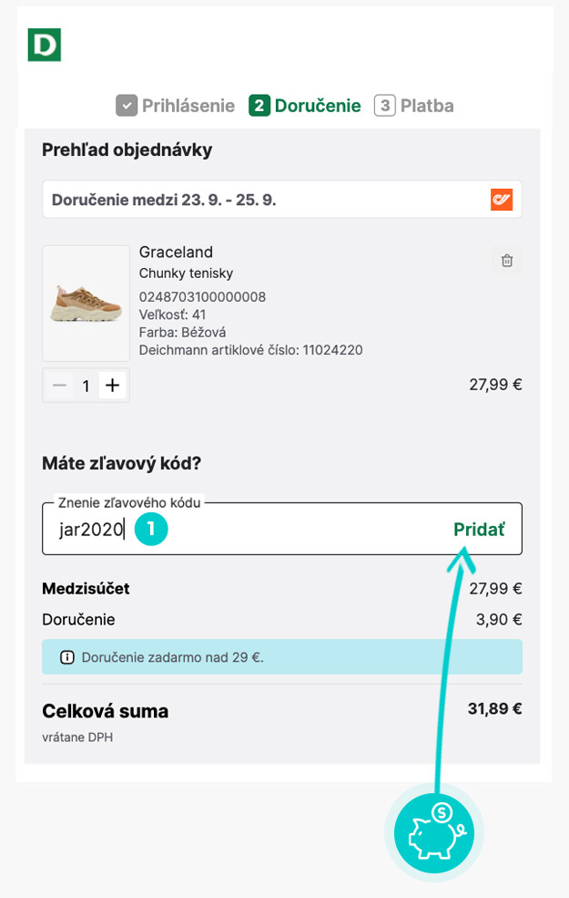 Vyberte si produkt v eshope Deichmann.sk, o ktorý máte záujem, stlačte tlačidlo „Pridať do košíka“ a produkt sa automaticky vloží do nákupného košíka. Priamo v nákupnom košíku nájdete vpravo v časti „Prehľad objednávky“ políčko „Znenie zľavového kódu“. Tu vložte skopírovaný zľavový kód alebo ho ručne vpíšte a potvrďte tlačidlom „Pridať“.