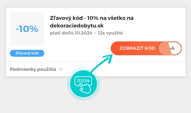 Vyberte si konkrétny zľavový kód na našej stránke, ktorý si chcete uplatniť v e-shope Dekoraciedobytu.sk. Kliknite na oranžové tlačidlo „Zobraziť kód“.