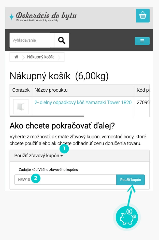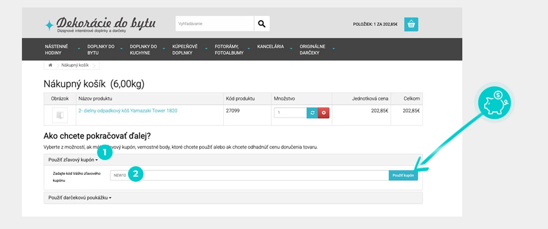 Vyberte si produkt v e-shope Dekoraciedobytu.sk, o ktorý máte záujem, stlačte tlačidlo „Do košíka“ a produkt sa automaticky vloží do nákupného košíka. Priamo v nákupnom košíku nájdete v pravej časti políčko „Zadajte svoj zľavový kód“. Tu vložte skopírovaný zľavový kód alebo ho ručne vpíšte a potvrďte tlačidlom „Aktivovať“.