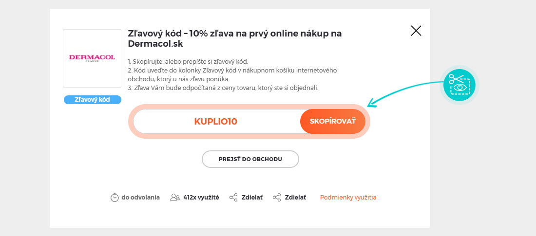 Skopírujte alebo si odpíšte zľavový kód a kliknite na tlačidlo „Prejsť do obchodu“. Následne budete presmerovaný priamo do e-shopu Dermacol.sk.