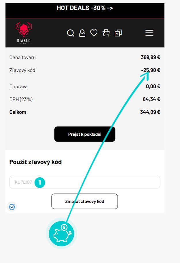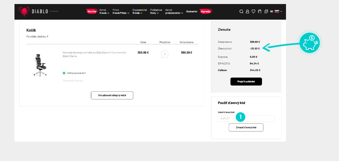 Vyberte si produkt v e-shope Diablochairs.com/sk, o ktorý máte záujem, stlačte tlačidlo „Do košíka“ a produkt sa automaticky vloží do nákupného košíka. Priamo v nákupnom košíku nájdete vpravo v časti "Zhrnutie" políčko „Použiť zľavový kód“. Tu vložte skopírovaný zľavový kód alebo ho ručne vpíšte a potvrďte tlačidlom „Uplatniť zľavu“.