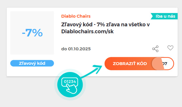 Vyberte si konkrétny zľavový kód na našej stránke, ktorý si chcete uplatniť v e-shope Diablochairs.com/sk. Kliknite na oranžové tlačidlo „Zobraziť kód“.