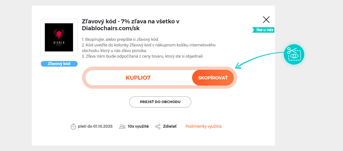 Skopírujte alebo si odpíšte zľavový kód a kliknite na tlačidlo „Prejsť do obchodu“. Následne budete presmerovaný priamo do e-shopu Diablochairs.com/sk.