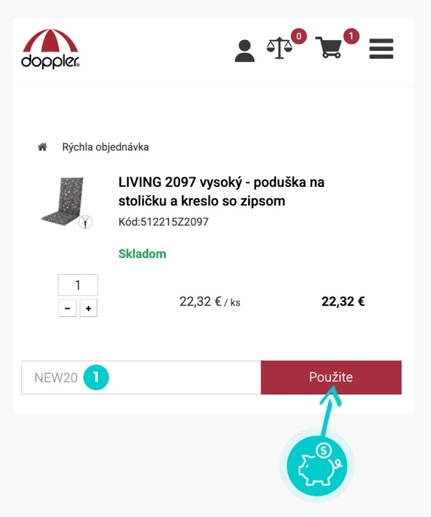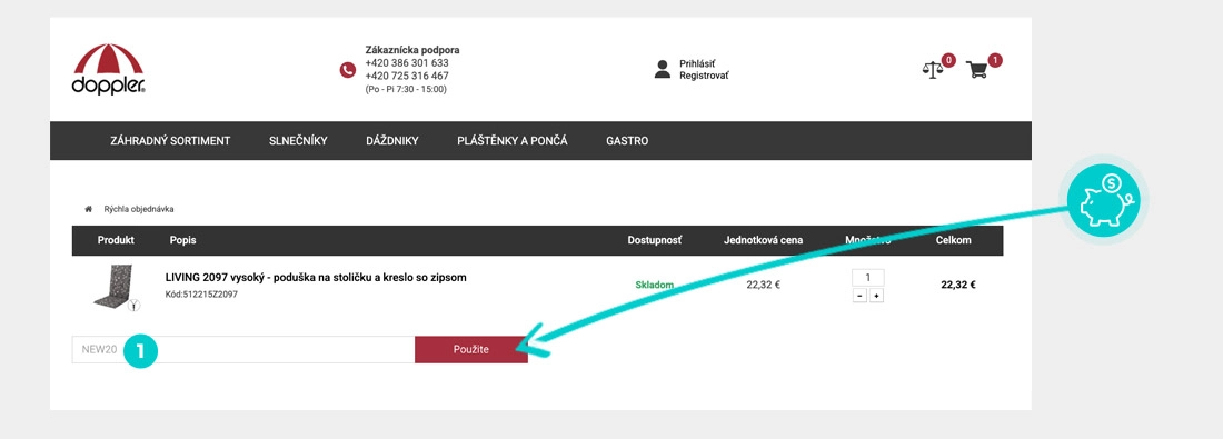 Vyberte si produkt v e-shope Dopplershop.sk, o ktorý máte záujem, stlačte tlačidlo „Do košíka“ a produkt sa automaticky vloží do nákupného košíka. Priamo v nákupnom košíku nájdete v prvom kroku objednávania pod zoznamom objednávaných produktov vľavo dole políčko „Vložte zľavový kupón“. Tu vložte skopírovaný zľavový kód alebo ho ručne vpíšte a potvrďte tlačidlom „Použite“.
