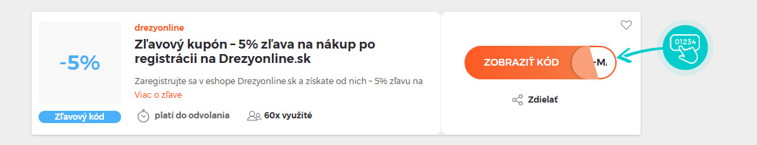 Vyberte si konkrétny zľavový kód na našej stránke, ktorý si chcete uplatniť v e-shope Drezyonline.sk. Kliknite na oranžové tlačidlo „Zobraziť kód“.