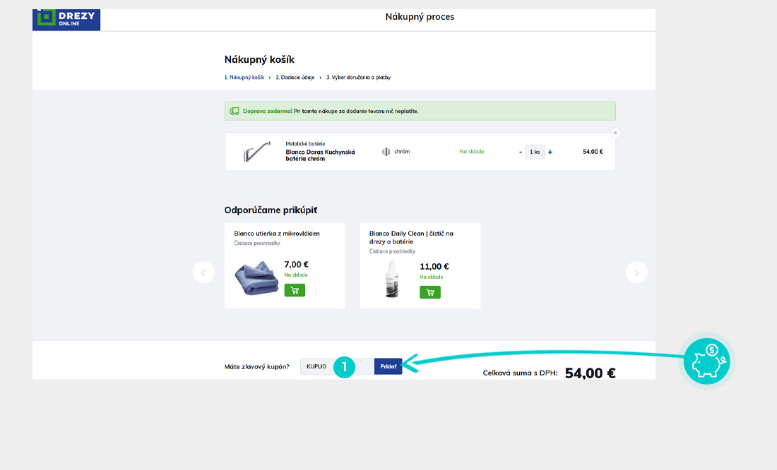 Vyberte si produkt v e-shope Drezyonline.sk, o ktorý máte záujem, stlačte tlačidlo „Do košíka“ a produkt sa automaticky vloží do nákupného košíka. Priamo v nákupnom košíku nájdete v prvom kroku objednávania pod zoznamom objednávaných produktov vľavo dole políčko „Chcete využiť zľavový kupón?“. Tu vložte skopírovaný zľavový kód alebo ho ručne vpíšte a potvrďte tlačidlom „Pridať“.
