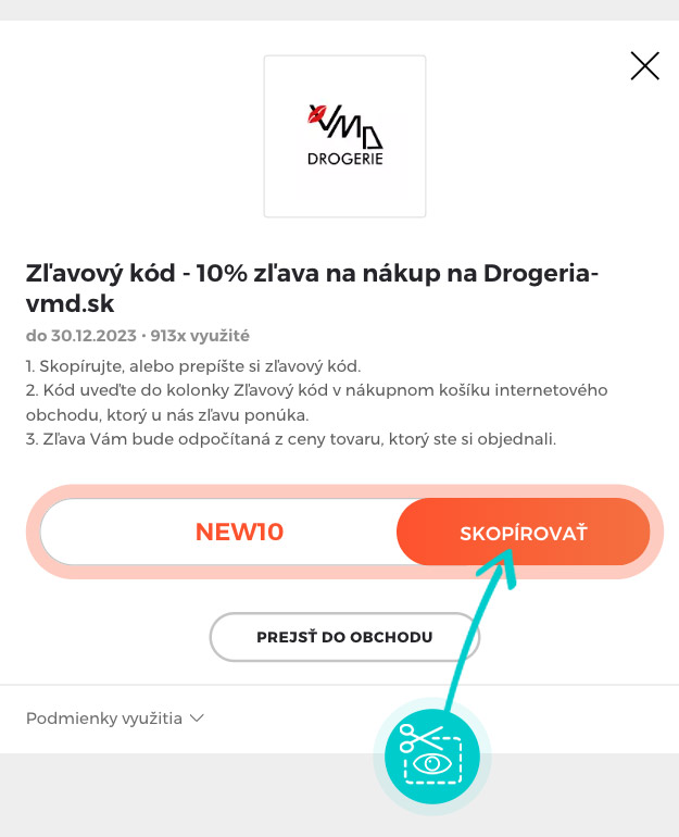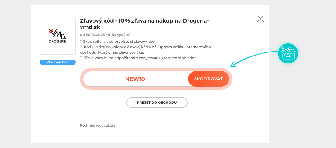 Skopírujte alebo si odpíšte zľavový kód a kliknite na tlačidlo „Prejsť do obchodu“. Následne budete presmerovaný priamo do e-shopu Drogeria-vmd.sk.