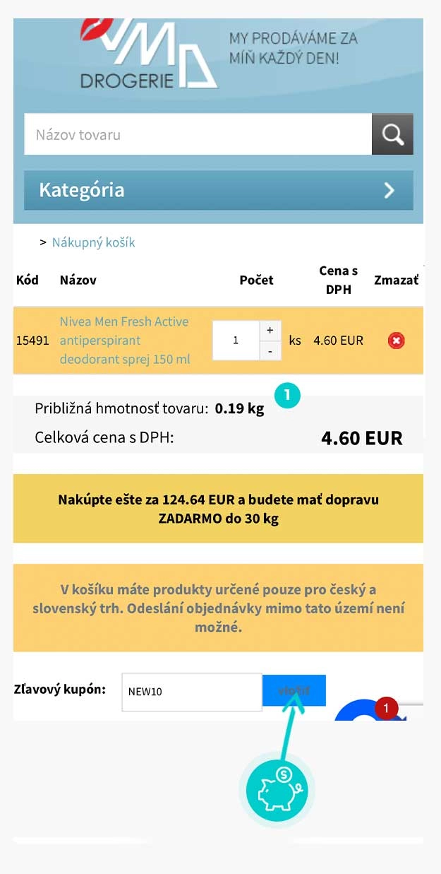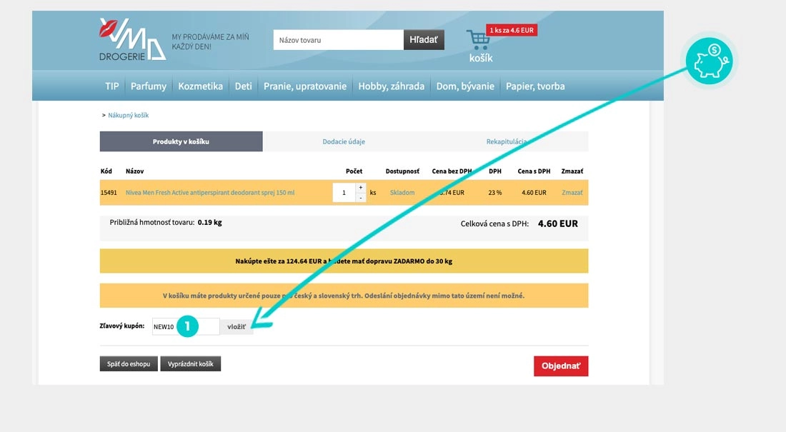 Vyberte si produkt v e-shope Drogeria-vmd.sk, o ktorý máte záujem, stlačte tlačidlo „Do košíka“ a produkt sa automaticky vloží do nákupného košíka. Priamo v nákupnom košíku nájdete v prvom kroku objednávania pod zoznamom objednávaných produktov políčko „Zľavový kupón“. Tu vložte skopírovaný zľavový kód alebo ho ručne vpíšte a potvrďte tlačidlom „Vložiť“.