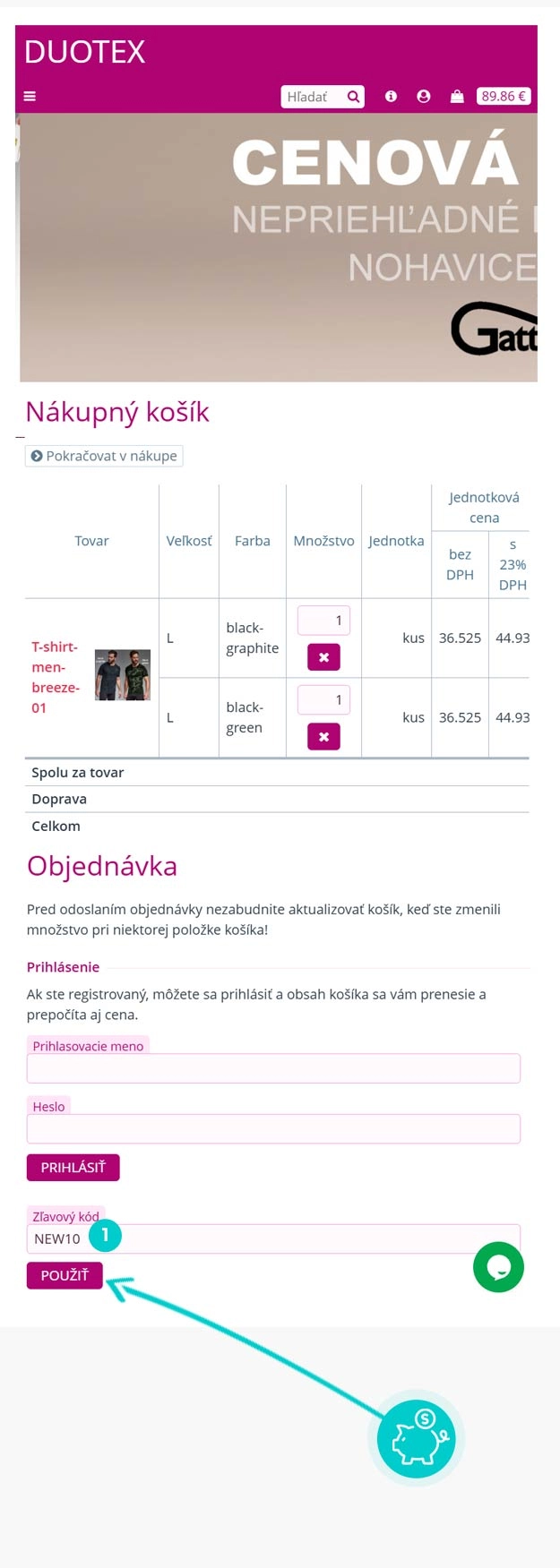 Vyberte si produkt v eshope Duotex.sk, o ktorý máte záujem, stlačte tlačidlo „Do košíka“ a produkt sa automaticky vloží do nákupného košíka. Priamo v nákupnom košíku nájdete vľavo políčko „Zľavový kód“. Tu vložte skopírovaný zľavový kód alebo ho ručne vpíšte a potvrďte tlačidlom „Použiť“.
