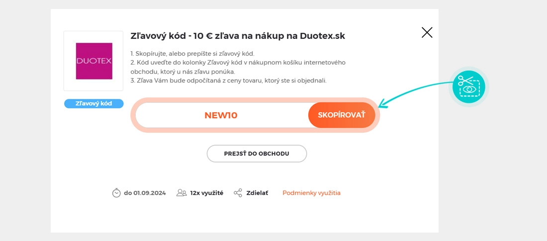 Skopírujte alebo si odpíšte zľavový kód a kliknite na tlačidlo „Prejsť do obchodu“. Následne budete presmerovaný priamo do eshopu Duotex.sk.
