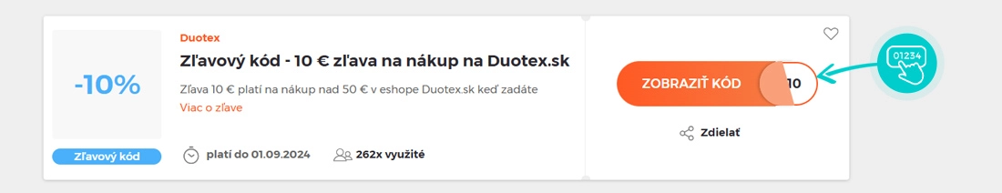 Vyberte si konkrétny zľavový kód na našej stránke, ktorý si chcete uplatniť v eshope Duotex.sk. Kliknite na oranžové tlačidlo „Zobraziť kód“.
