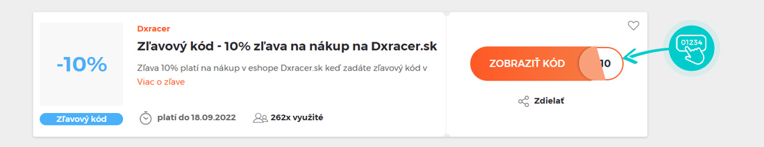 Vyberte si konkrétny zľavový kód na našej stránke, ktorý si chcete uplatniť v eshope Dxracer.sk. Kliknite na oranžové tlačidlo „Zobraziť kód“.