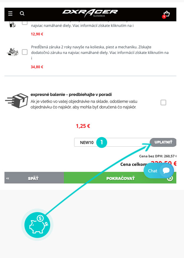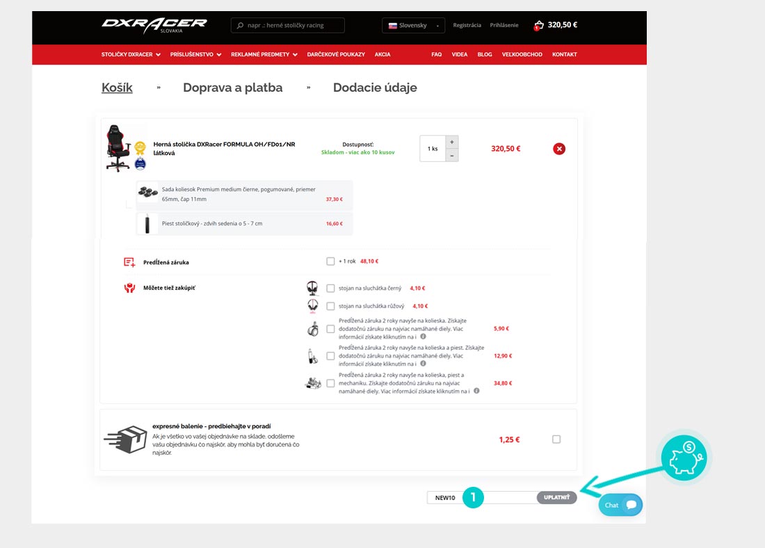 Vyberte si produkt v eshope Dxracer.sk, o ktorý máte záujem, stlačte tlačidlo „Kúpiť“ a produkt sa automaticky vloží do nákupného košíka. Priamo v nákupnom košíku nájdete pod Vami vybraným produktom políčko „Zľavový kupón vložte tu“. Tu vložte skopírovaný zľavový kód alebo ho ručne vpíšte a potvrďte tlačidlom „Uplatniť“.