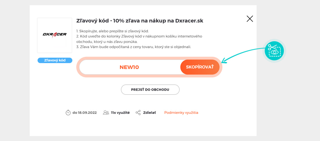 Skopírujte alebo si odpíšte zľavový kód a kliknite na tlačidlo „Prejsť do obchodu“. Následne budete presmerovaný priamo do eshopu Dxracer.sk.
