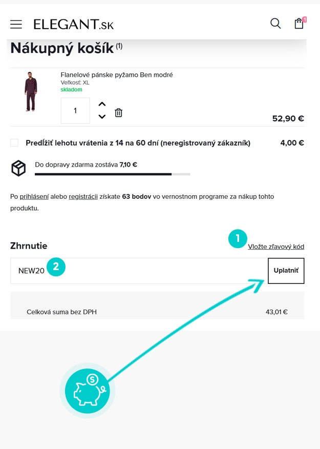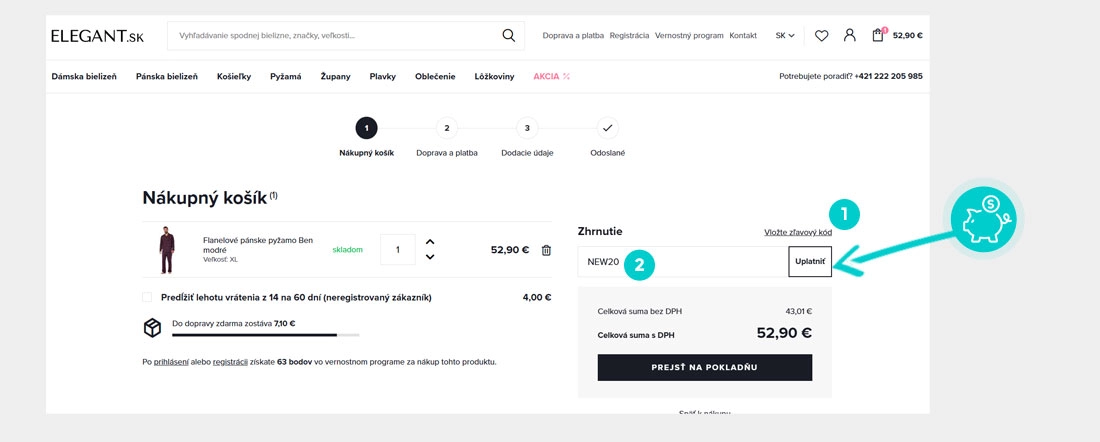 Vyberte si produkt v e-shope Elegant.sk, o ktorý máte záujem, stlačte tlačidlo „Do košíka“ a produkt sa automaticky vloží do nákupného košíka. Priamo v nákupnom košíku nájdete vpravo v časti "Zhrnutie" políčko „Vložte zľavový kód“. Tu vložte skopírovaný zľavový kód alebo ho ručne vpíšte a potvrďte tlačidlom „Uplatniť“.