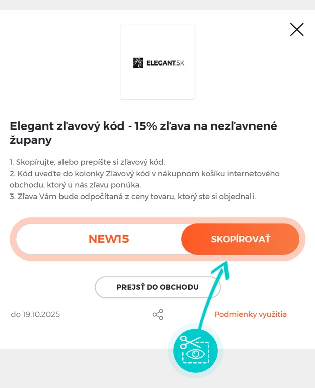 Skopírujte alebo si odpíšte zľavový kód a kliknite na tlačidlo „Prejsť do obchodu“. Následne budete presmerovaný priamo do e-shopu Elegant.sk.