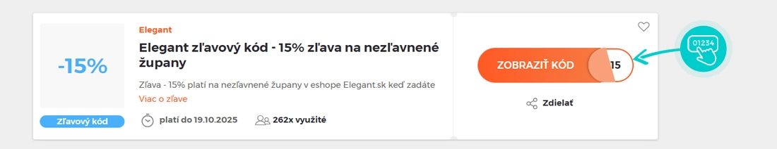 Vyberte si konkrétny zľavový kód na našej stránke, ktorý si chcete uplatniť v e-shope Elegant.sk. Kliknite na oranžové tlačidlo „Zobraziť kód“.